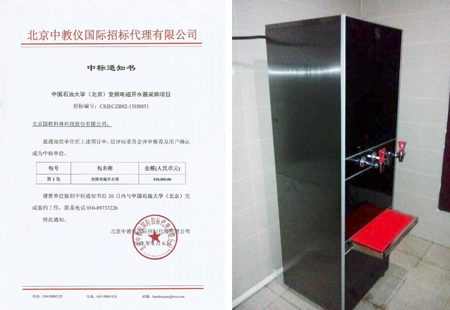 2015年8月份,我公司中標中國石油大學(北京)變頻電磁開水器采購項目。此次我公司為其學校安裝了40臺電磁開水器。