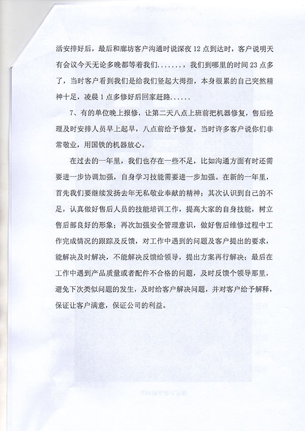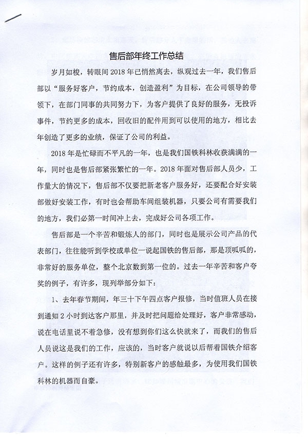 歲月如梭,轉眼間2018年已悄然離去,縱觀過去一年,我們售后部以“服務好客戶,節(jié)約成本,創(chuàng)造盈利”為目標,在公司領導的帶領下,在部門同事的共同努力下,為客戶提供了良好的服務,無投訴事件,節(jié)約更多的成本,回收舊的配件用到可以使用的地方,相比去年創(chuàng)造了更多的業(yè)績,保證了公司的利益。下面我將售后部對本年度的工作做以總結: